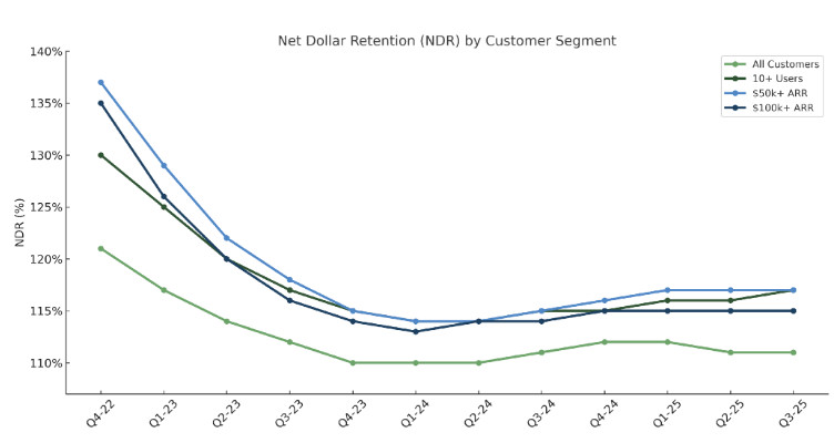 Метрики крупных клиентов подтверждают этот сдвиг. По итогам 3-го квартала 2025 года число клиентов с годовой повторяющейся выручкой свыше $100 тыс. достигло 1,603, и рост составил 48% год к году (г/г). Сегмент клиентов с выручкой выше $500 тыс. увеличился до 78, показав рост на 73% г/г. Еще более показателен двухлетний срез: с 3-го квартала 2023 года количество клиентов $100 тыс.+ выросло с 749 до 1,603, то есть более чем в два раза. Именно такое улучшение качества клиентской базы рынок обычно оценивает выше, чем простое увеличение числа небольших аккаунтов.