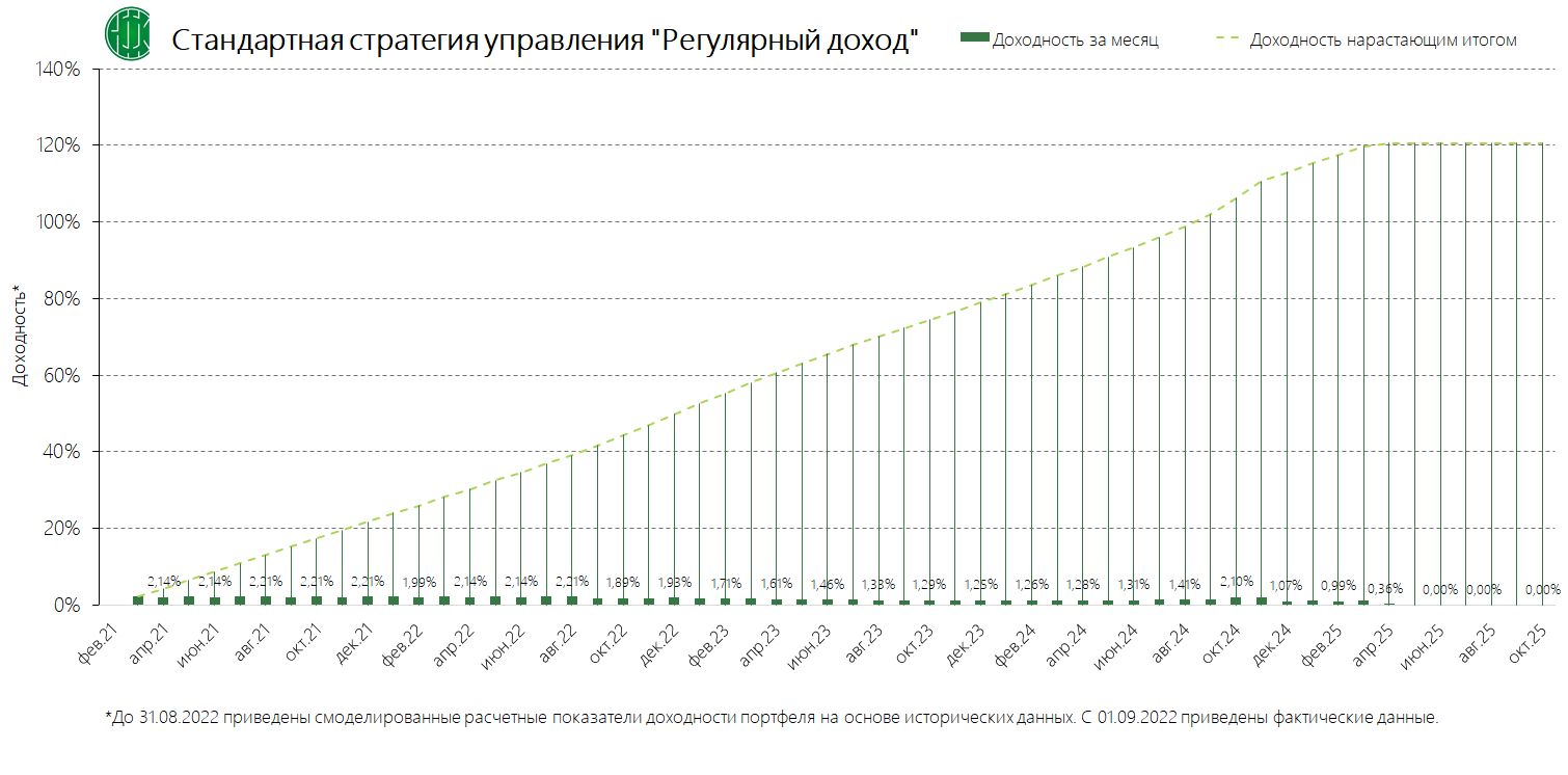 PDFСтандартная стратегия управления «Регулярный доход» (применяется с 13.11.2024) Динамика среднемесячной доходностиПубликация: 29.10.2024 15:44Актуальность: с 13.11.2024 00:00 по дату отмены