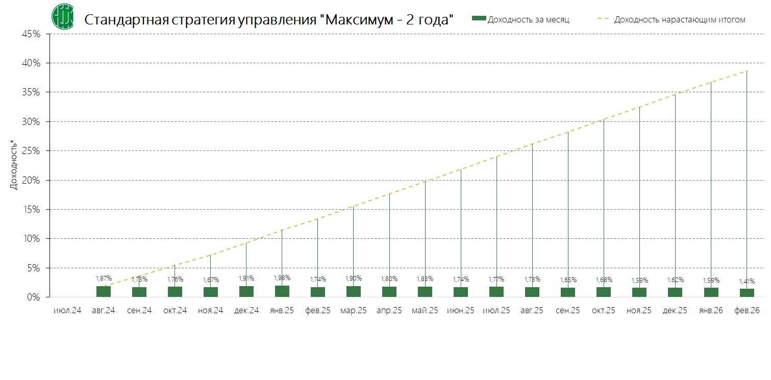 PDFСтандартная стратегия управления «Максимум – 2 года» (применяется с 04.12.2024) Динамика среднемесячной доходностиПубликация: 19.11.2024 21:45Актуальность: с 04.12.2024 00:00 по дату отмены