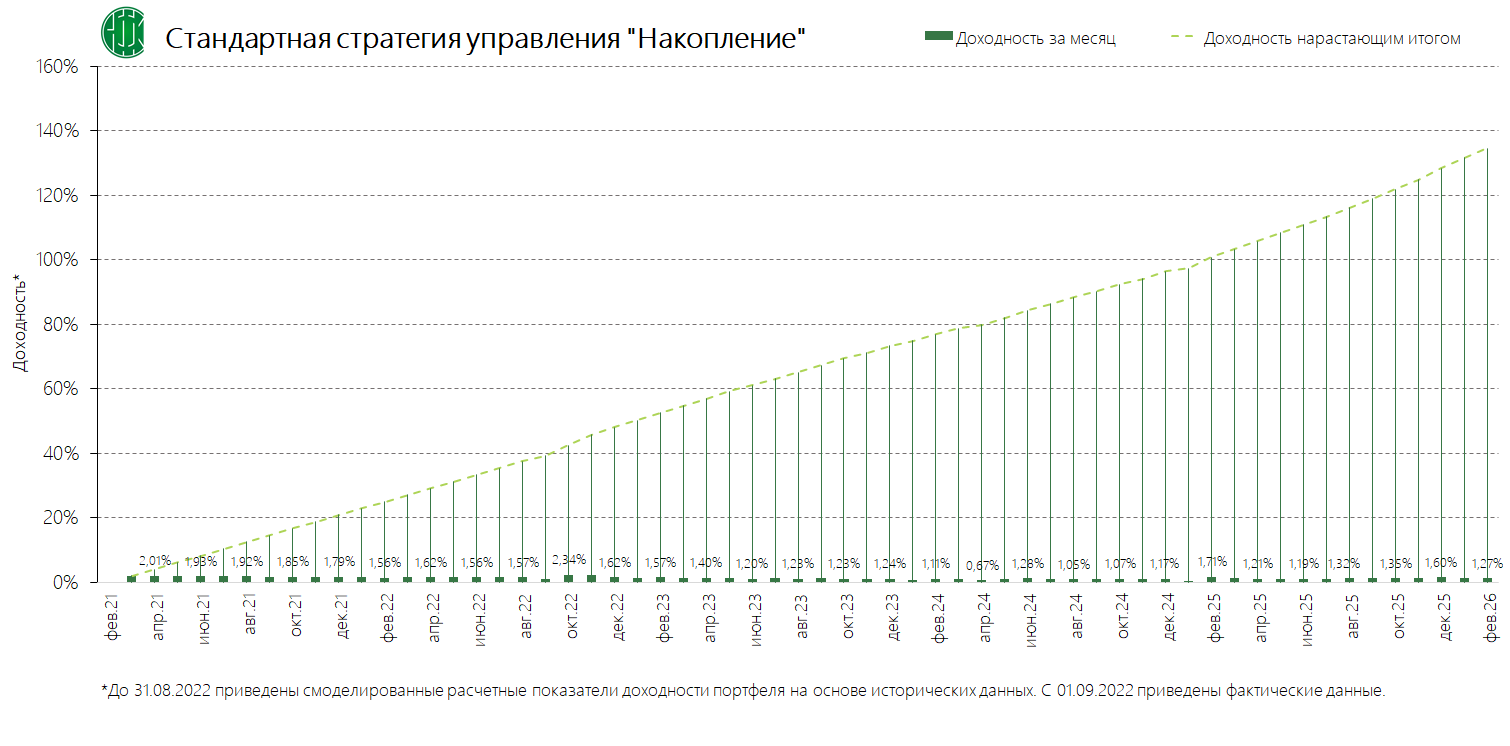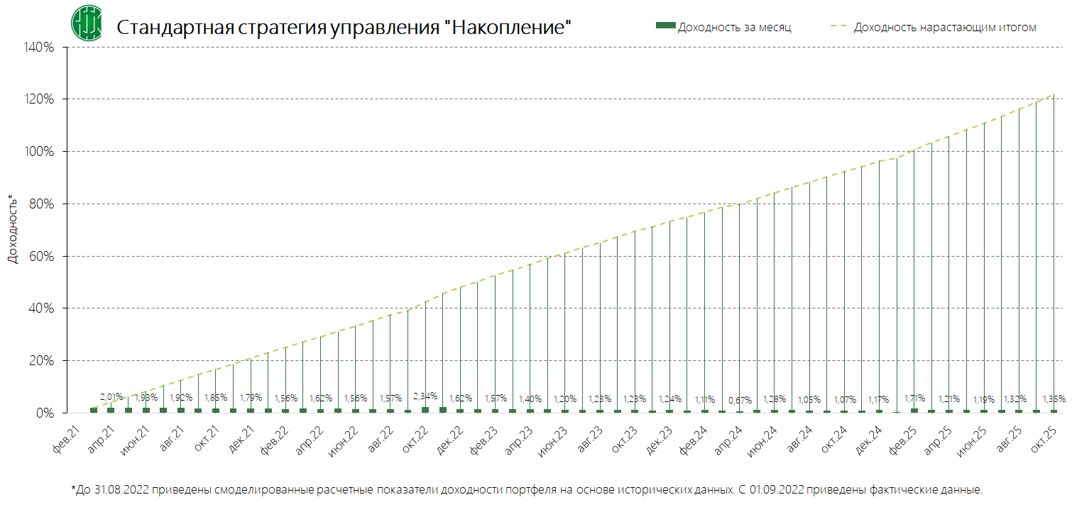 PDFСтандартная стратегия управления «Накопление» (применяется с 13.11.2024) Динамика среднемесячной доходностиПубликация: 29.10.2024 15:43Актуальность: с 13.11.2024 00:00 по дату отмены