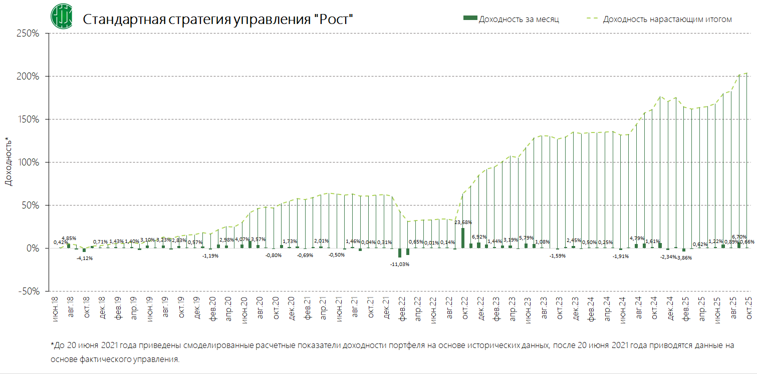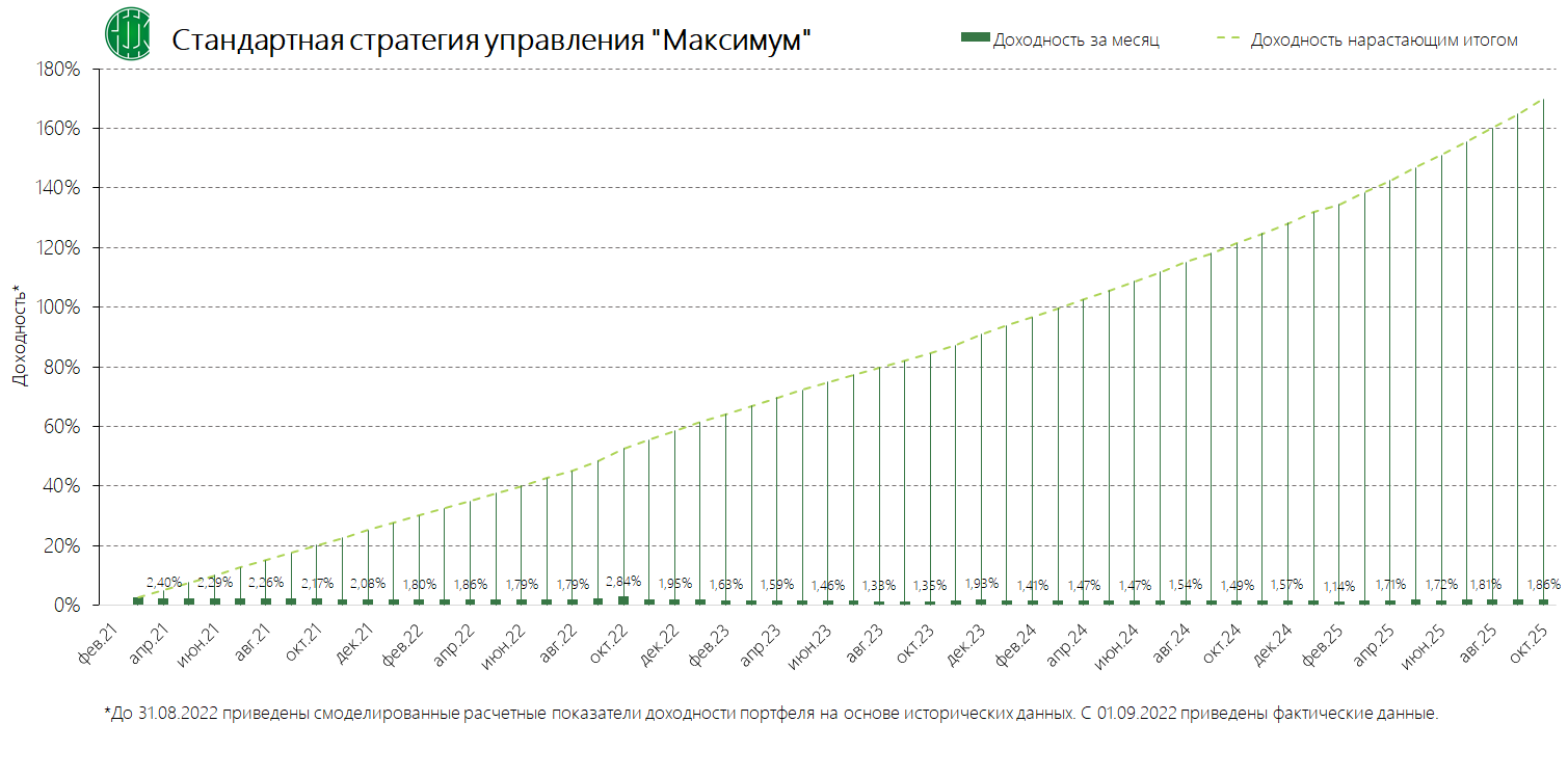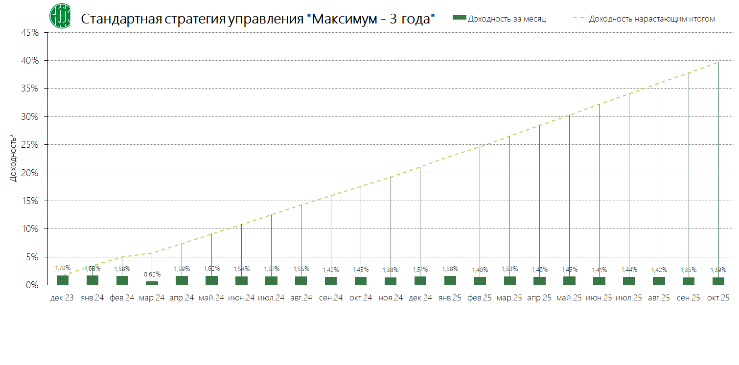 PDFСтандартная стратегия управления «Максимум – 3 года» (применяется с 04.12.2024) Динамика среднемесячной доходностиПубликация: 19.11.2024 21:47Актуальность: с 04.12.2024 00:00 по дату отмены