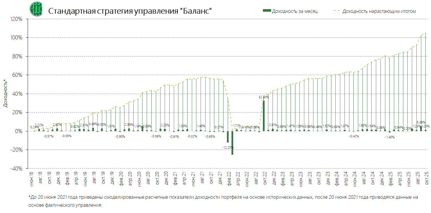 PDFСтандартная стратегия управления «Баланс» (применяется с 13.09.2024) Динамика среднемесячной доходностиПубликация: 29.08.2024 20:38Актуальность: с 13.09.2024 00:00 по дату отмены
