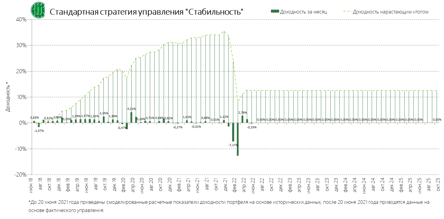 PDFСтандартная стратегия управления «Стабильность» (применяется с 13.09.2024) Динамика среднемесячной доходностиПубликация: 29.08.2024 20:36Актуальность: с 13.09.2024 00:00 по дату отмены