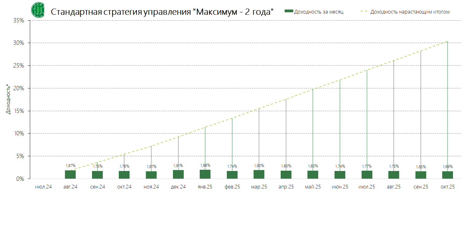 PDFСтандартная стратегия управления «Максимум – 2 года» (применяется с 13.11.2024) Динамика среднемесячной доходностиИзменено: 19.11.2024 21:42Публикация: 29.10.2024 15:50Актуальность: с 13.11.2024 00:00 по 03.12.2024 23:59