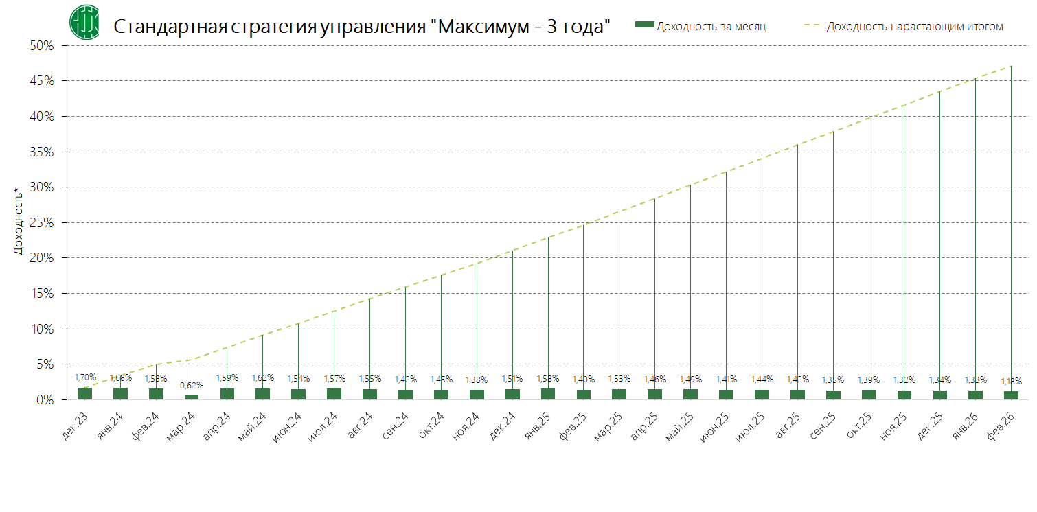 PDFСтандартная стратегия управления «Максимум – 3 года» (применяется с 04.12.2024) Динамика среднемесячной доходностиПубликация: 19.11.2024 21:47Актуальность: с 04.12.2024 00:00 по дату отмены