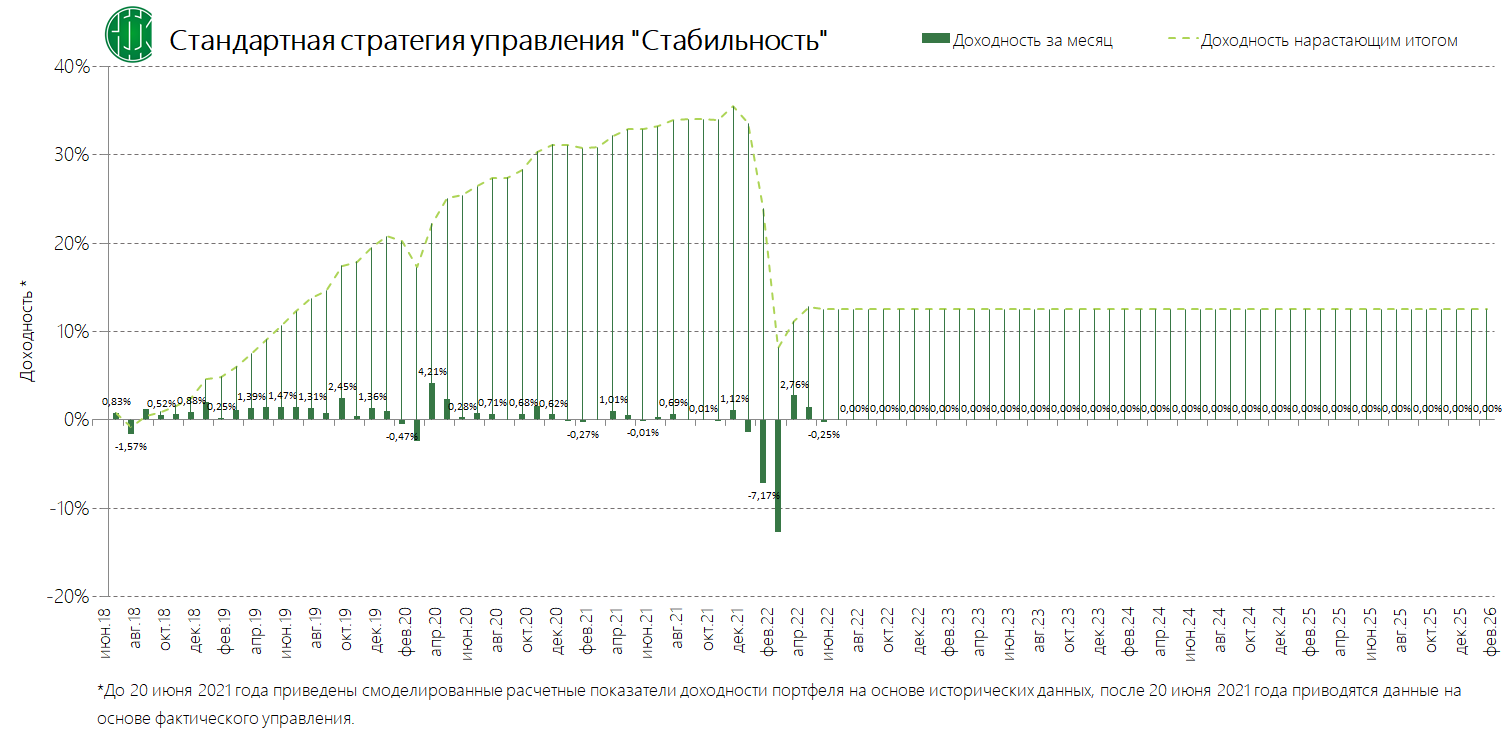 PDFСтандартная стратегия управления «Стабильность» (применяется с 13.09.2024) Динамика среднемесячной доходностиПубликация: 29.08.2024 20:36Актуальность: с 13.09.2024 00:00 по дату отмены