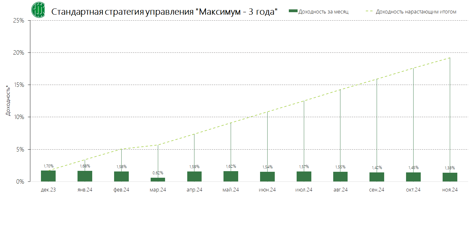 PDFСтандартная стратегия управления «Максимум – 3 года» (применяется с 13.11.2024) Динамика среднемесячной доходностиИзменено: 19.11.2024 21:43Публикация: 29.10.2024 15:51Актуальность: с 13.11.2024 00:00 по 03.12.2024 23:59