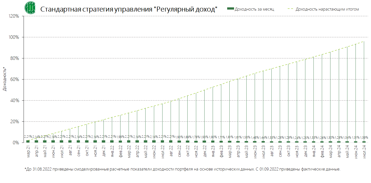 PDFСтандартная стратегия управления «Регулярный доход» (применяется с 08.10.2023) Динамика среднемесячной доходностиИзменено: 29.08.2024 20:34Публикация: 27.09.2023 17:02Актуальность: с 08.10.2023 17:01 по 12.09.2024 23:59