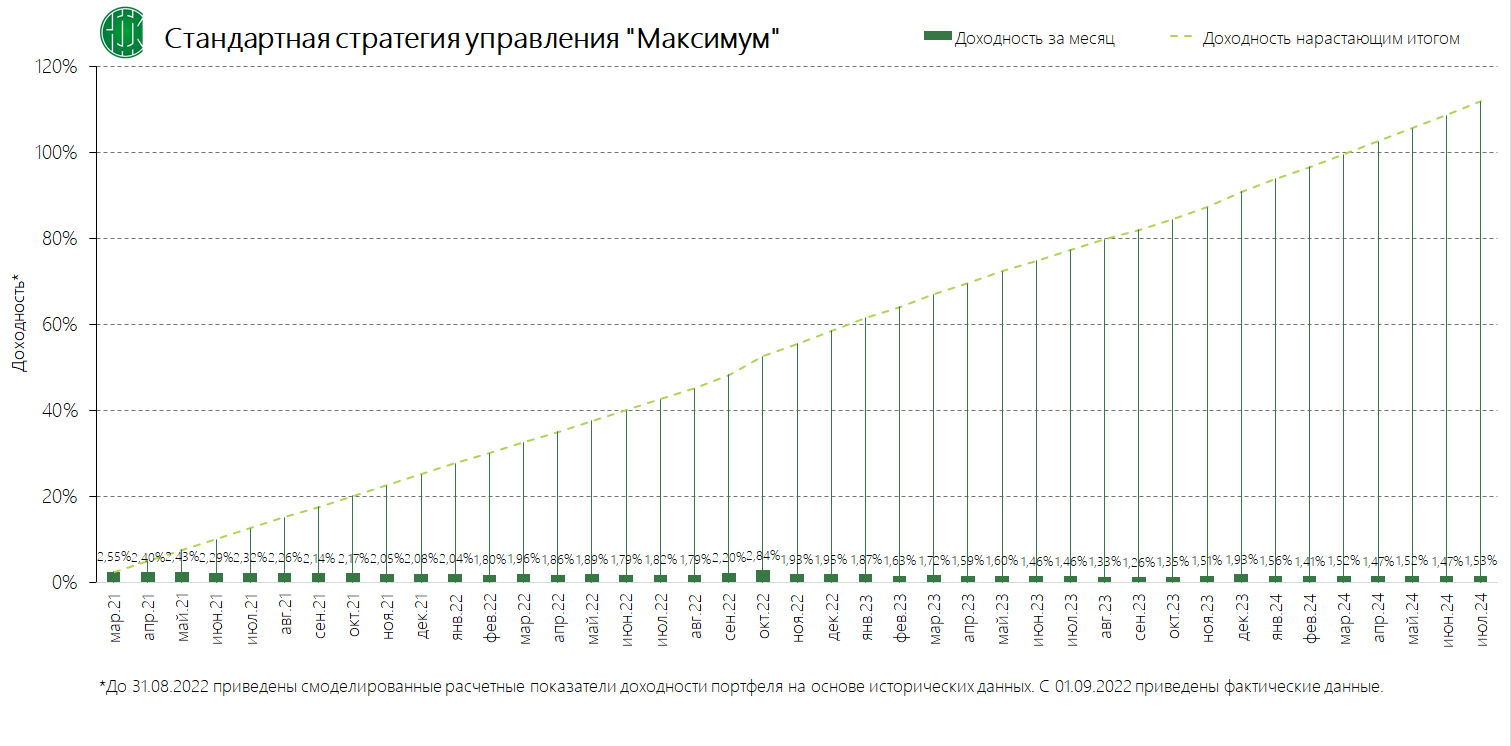 PDFСтандартная стратегия управления «Максимум» (применяется с 02.06.2024) Динамика среднемесячной доходностиИзменено: 29.08.2024 20:34Публикация: 23.05.2024 22:14Актуальность: с 02.06.2024 22:15 по 12.09.2024 23:59