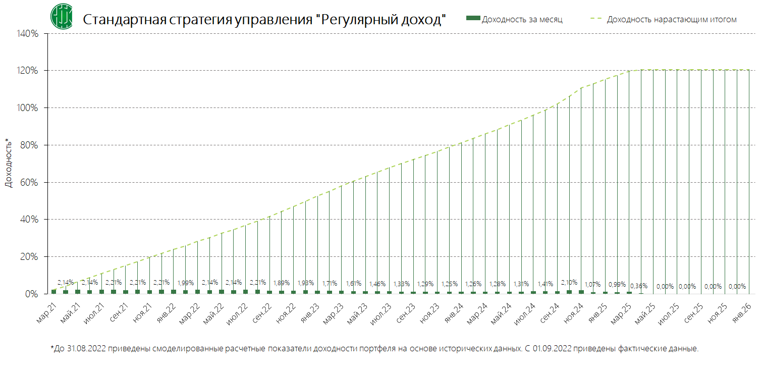 PDFСтандартная стратегия управления «Регулярный доход» (применяется с 13.11.2024) Динамика среднемесячной доходностиПубликация: 29.10.2024 15:44Актуальность: с 13.11.2024 00:00 по дату отмены
