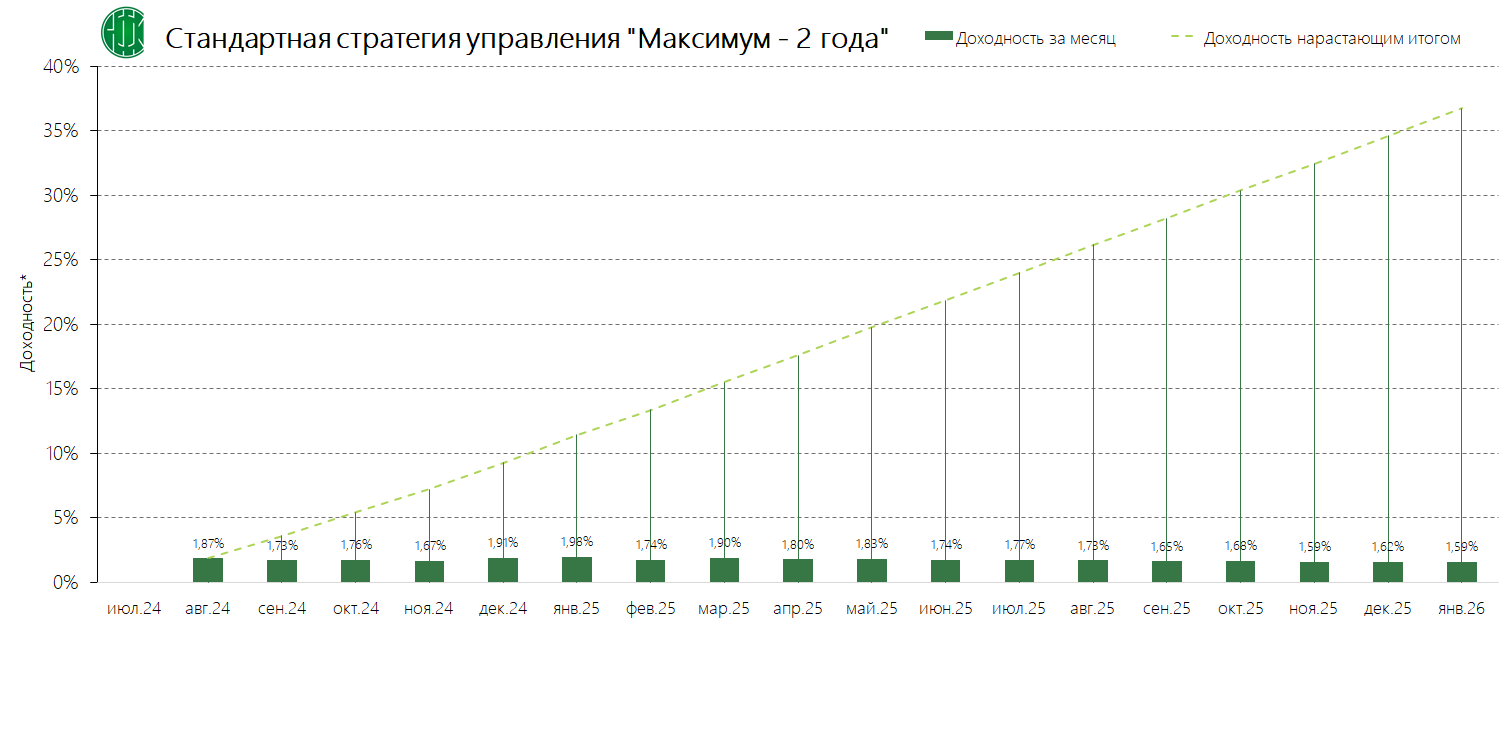 PDFСтандартная стратегия управления «Максимум – 2 года» (применяется с 04.12.2024) Динамика среднемесячной доходностиПубликация: 19.11.2024 21:45Актуальность: с 04.12.2024 00:00 по дату отмены
