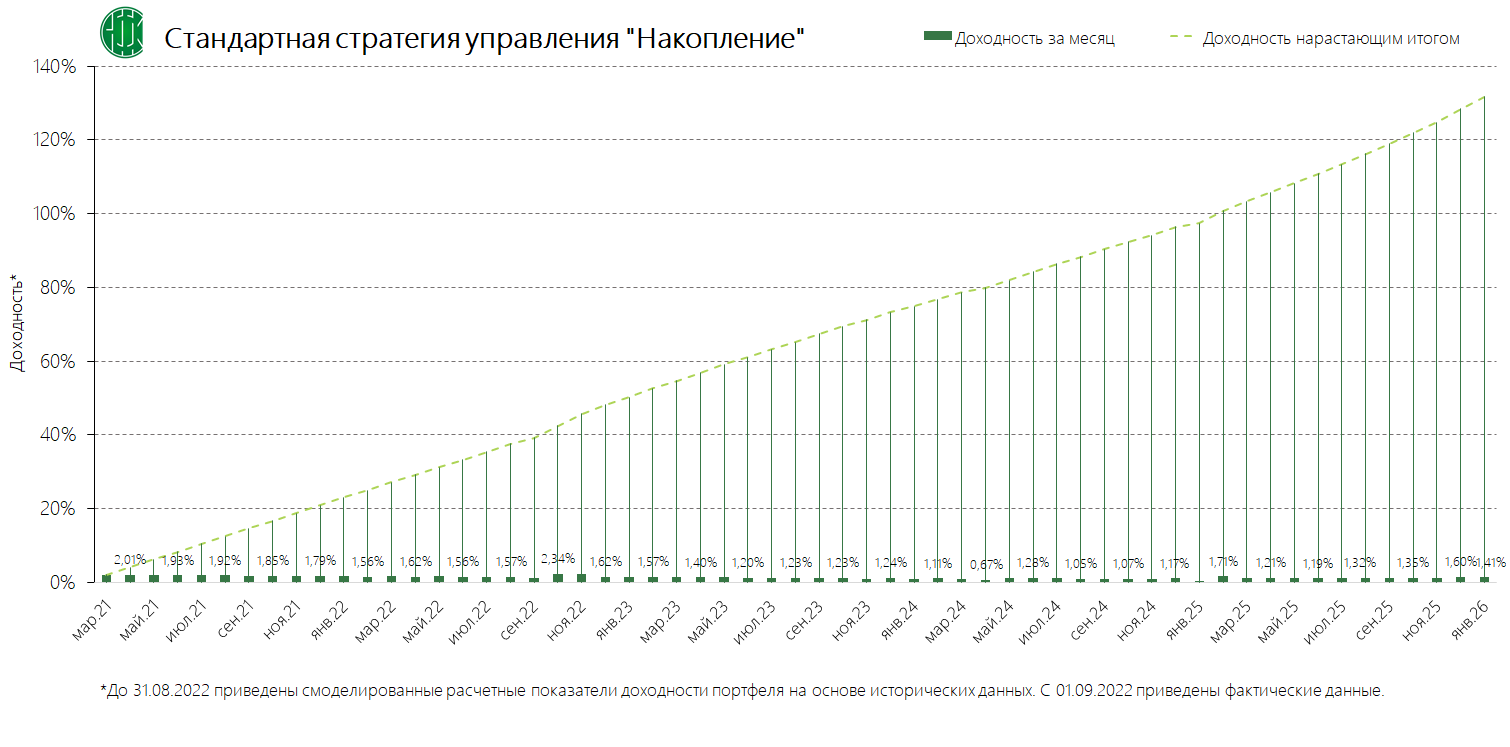 PDFСтандартная стратегия управления «Накопление» (применяется с 13.11.2024) Динамика среднемесячной доходностиПубликация: 29.10.2024 15:43Актуальность: с 13.11.2024 00:00 по дату отмены
