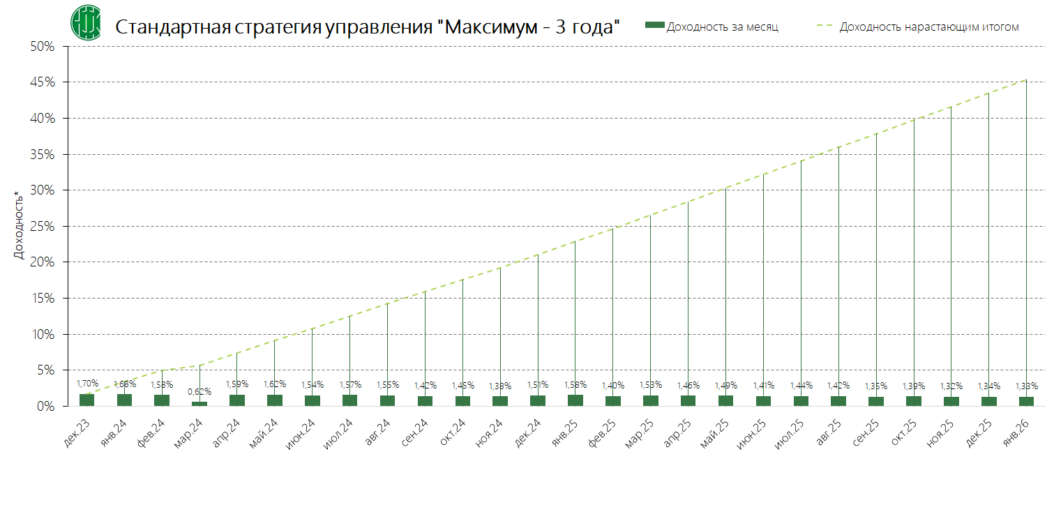 PDFСтандартная стратегия управления «Максимум – 3 года» (применяется с 04.12.2024) Динамика среднемесячной доходностиПубликация: 19.11.2024 21:47Актуальность: с 04.12.2024 00:00 по дату отмены