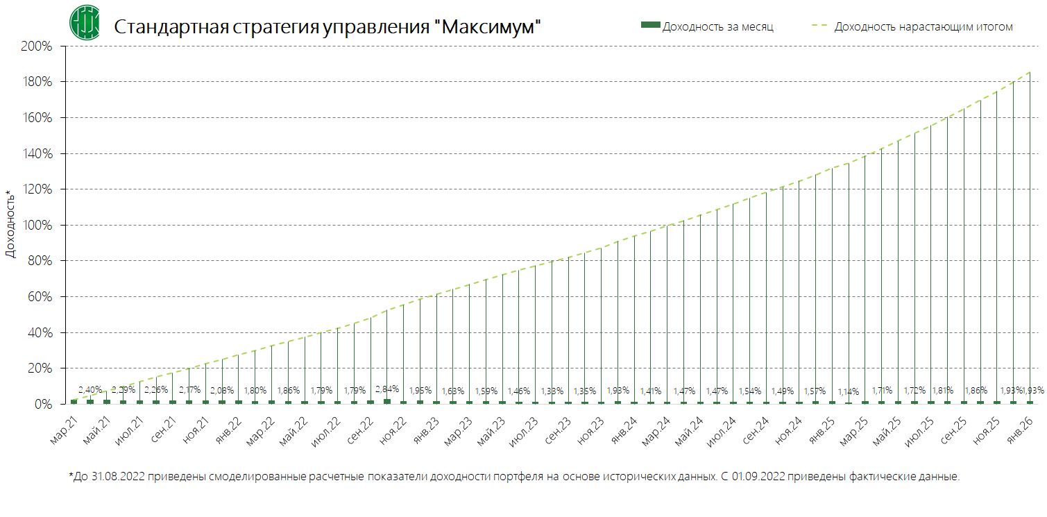 PDFСтандартная стратегия управления «Максимум» (применяется с 13.11.2024) Динамика среднемесячной доходностиПубликация: 29.10.2024 15:49Актуальность: с 13.11.2024 00:00 по дату отмены