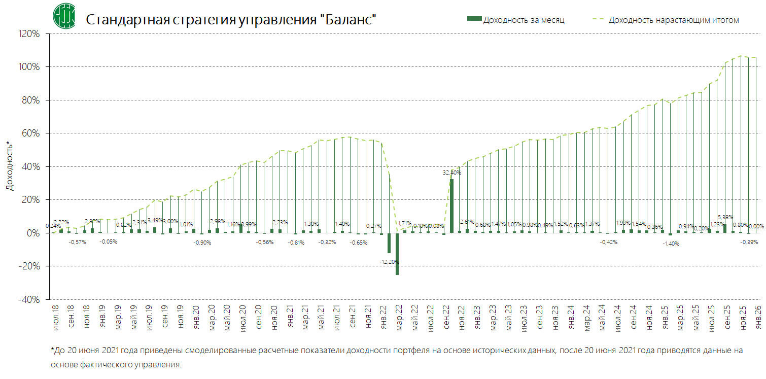 PDFСтандартная стратегия управления «Баланс» (применяется с 13.09.2024) Динамика среднемесячной доходностиПубликация: 29.08.2024 20:38Актуальность: с 13.09.2024 00:00 по дату отмены